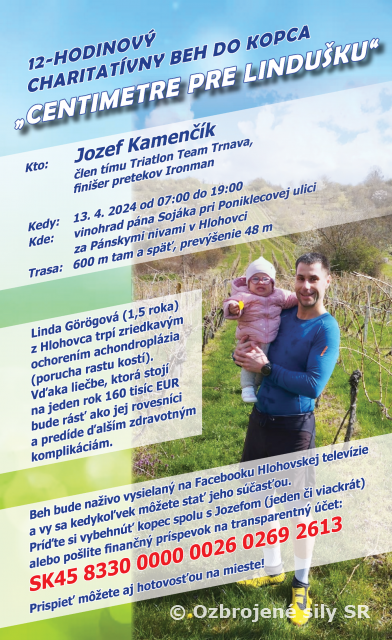 Príslušník 53. práporu poľných Hlohovec a člen tímu Triatlon team Trnava, finišer viacerých pretekov Ironman nadrotmajster Jozef Kamenčík chce „vybehať centimetre“ 1,5-ročnej malej Hlohovčanke, Linde Görögovej s poruchou rastu kostí. Jozef plánuje 13. apríla od siedmej hodiny ráno behať 12 hodín po strmom kopci viníc (600 m tam a späť, prevýšenie 48 m, sklon miestami cez 30 %). Počas trvania behu bude spustená finančná zbierka.