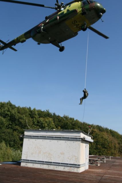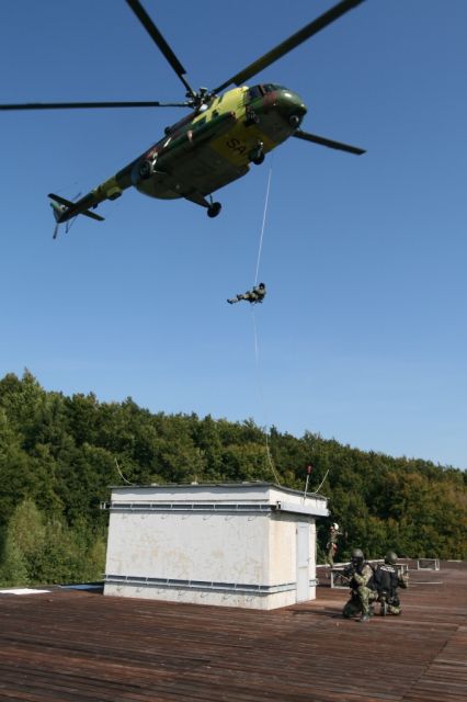 Druhý deň cvičenia BLUE SECURITY 2012 začal v utorok ráno plánovanými aktivitami v priestoroch JAKUB HIGH-RISE BUILDING GUN – tzv. „Malej Moskve.“ Každá zo skupín pre riešenie krízových situácií /SkRKS/ mala rovnaký námet – zaistenie nebezpečného páchateľa. Ten sa nachádzal v jednom z bytov v Malej Moskve. Túto úlohu riešili vojenskí policajti v súčinnosti s príslušníkmi vrtuľníkového krídla z Prešova, ktorí zabezpečili prepravu príslušníkov SkRKS na určené miesto vrtuľníkom. Zásah sa realizoval zo vzduchu zlanením na strechu, zaistením priestoru, vstupu do budovy, preniknutím do určeného bytu, vyhľadaním a zaistením nebezpečného páchateľa a jeho eskortáciou pred vyšetrovateľa. Všetky vykonávané činnosti boli realizované v súlade so zákonom o Vojenskej polícii a oprávneniami, ktoré sú v ňom pre činnosť Vojenskej polície stanovené.