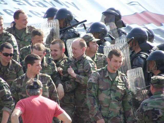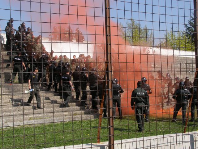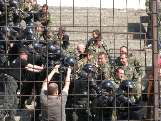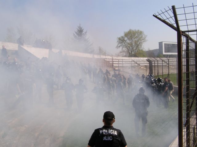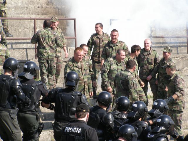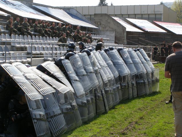 Výcvik príslušníkov jednotky na posilnenie policajného zboru Profesionálni vojaci práporu podpory velenia (prpv) PS sa vo štvrtok 25. apríla spolu s policajným zborom miest Trenčín, Trnava a Nitra zúčastnili na Mestskom futbalovom štadióne v Trenčíne výcviku príslušníkov jednotky na posilnenie policajného zboru. Súčasťou prípravy je aj zjednanie verejného poriadku a zvládnutie davu , v anglickej terminológii „Public Order“. Tohto výcviku sa zúčastnilo päťdesiatjeden profesionálnych vojakov práporu podpory velenia pod riadením zástupcu veliteľa prpv PS majora Andreja Juránka. Pod velením krajského riaditeľa PZ Trenčín na základe presných povelov jednotka imitovala demonštrantov a agresívnych narušiteľov na tribúne s príslušníkmi policajného zboru a následne vojaci nacvičovali správnu podporu policajnej kordóny pri potláčaní davu a ich upokojovanie a odzbrojovanie pri nastoľovaní poriadku na tribúne. Vojaci musia adekvátne reagovať a bezchybne využívať dostupné podporné prostriedky, znášať údery agresívnych narušiteľov a s použitím chmatov a techník výtržníkov znehybňovať.
