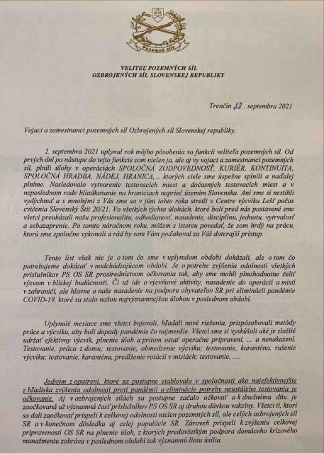 2. septembra 2021 uplynul rok môjho pôsobenia vo funkcii veliteľa pozemných síl. Od prvých dní po nástupe do tejto funkcie som nielen ja, ale aj vy vojaci a zamestnanci pozemných síl, plnili úlohy v operáciách SPOLOČNÁ ZODPOVEDNOSŤ, KURIÉR, KONTINUITA, SPOLOČNÁ HRADBA, NÁDEJ, HRANICA,... ktorých ciele sme úspešne splnili a naďalej plníme. Nasledovalo vytvorenie testovacích miest a dočasných testovacích miest a v neposlednom rade hliadkovanie na hraniciach naprieč územím Slovenska. Ani sme si nestihli vydýchnuť a s mnohými z Vás sme sa v júni tohto roka stretli v Centre výcviku Lešť počas cvičenia Slovenský Štít 20/21. Vo všetkých týchto úlohách, ktoré boli pred nás postavené sme všetci preukázali našu profesionalitu, odhodlanosť, nasadenie, disciplínu, jednotu, vytrvalosť a sebazaprenie. Po tomto náročnom roku, môžem s istotou povedať, že som hrdý na prácu, ktorú sme spoločne vykonali a rád by som Vám poďakoval za Váš doterajší prístup.