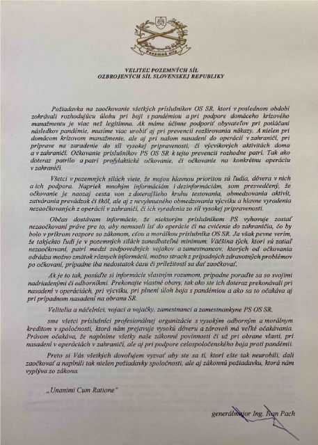 Tento list však nie je o tom čo sme v uplynulom období dokázali, ale o tom čo potrebujeme dokázať v nadchádzajúcom období. Je o potrebe zvýšenia odolnosti všetkých príslušníkov PS OS SR prostredníctvom očkovania tak, aby sme mohli plnohodnotne čeliť výzvam v blízkej budúcnosti. Či už ide o výcvikové aktivity, nasadenie do operácií a misií v zahraničí, ale hlavne o naše nasadenie na podporu obyvateľov SR pri eliminácii pandémie COVID-19, ktoré sa stalo našou najvýznamnejšou úlohou v poslednom období.